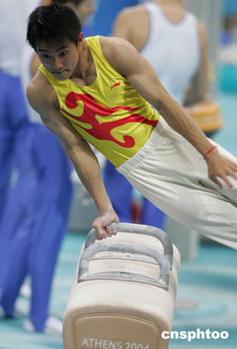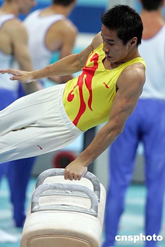 中國(guó)男子體操隊(duì)當(dāng)?shù)貢r(shí)間八月十一日晚上在雅典奧運(yùn)體操比賽館與德國(guó)、日本、烏克蘭隊(duì)進(jìn)行集體合練。中新社記者:毛建軍