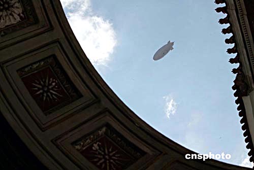 8月12日,一架監(jiān)視飛艇從雅典市區(qū)上空飛過,監(jiān)視各種情況的發(fā)生,以確保奧運(yùn)會(huì)的安全。中新社記者:王瑤