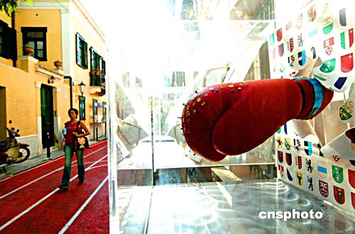奧運開幕在即,在雅典奧運主題一條街上,一只拳擊手套橫空出世,為古老街景增添奧運氣氛。中新社記者:王瑤