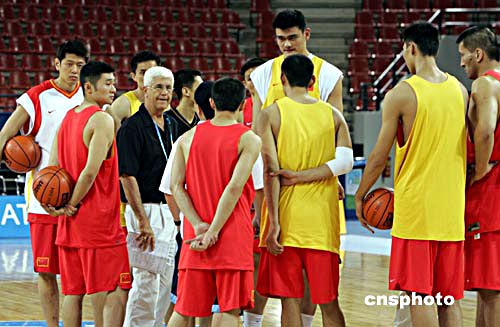 將要在開幕式上擔任中國代表團旗手的姚明在訓(xùn)練中與主教練交流。