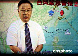 中國氣象局局長秦大河八月十二日在中央電視臺(tái)黃金時(shí)間的天氣預(yù)報(bào)節(jié)目上首次亮相,發(fā)布中國大部分地區(qū)即將出現(xiàn)臺(tái)風(fēng)和暴雨的緊急警報(bào),同時(shí)顯示紅色的中國地質(zhì)災(zāi)害警報(bào)。中新社記者:賈國榮