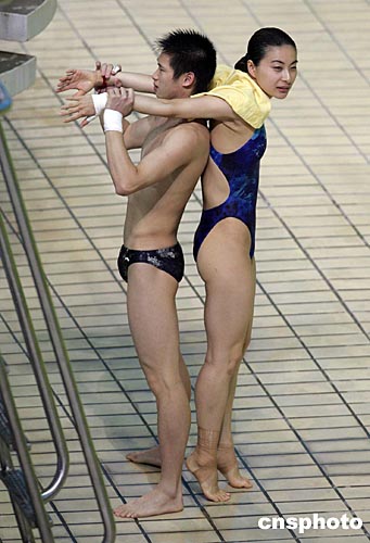 雅典時(shí)間八月十二日下午,中國(guó)女子跳水名將郭晶晶在隊(duì)友的幫助下進(jìn)行奧運(yùn)賽前訓(xùn)練的準(zhǔn)備活動(dòng)。中新社記者:毛建軍