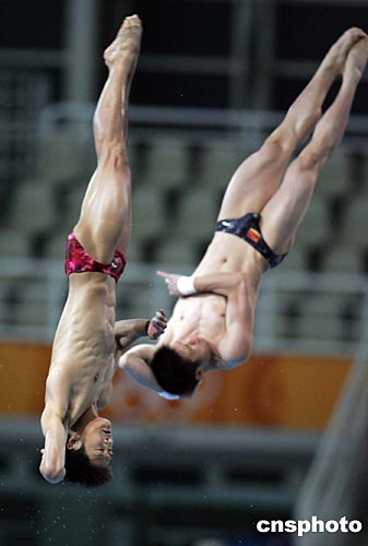 中國跳水隊隊員田亮、楊景輝當(dāng)?shù)貢r間八月十二日下午在雅典進行賽前訓(xùn)練,他們將在十四日開始的奧運首日賽事中角逐男子十米跳臺雙人金牌。中新社記者:毛建軍