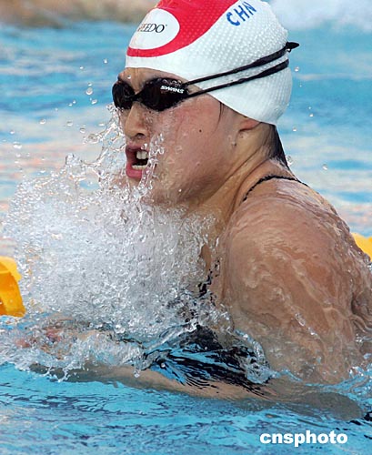 中國游泳名將羅雪娟當(dāng)?shù)貢r(shí)間八月十二日下午在雅典奧運(yùn)賽場進(jìn)行賽前訓(xùn)練。中新社記者:毛建軍