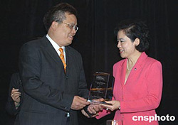 美東時(shí)間八月十二日,由美國(guó)聯(lián)邦政府舉辦的紐約區(qū)二○○四年少數(shù)族裔企業(yè)發(fā)展周活動(dòng)在紐約開幕。美國(guó)商務(wù)部少數(shù)族裔商業(yè)發(fā)展署副署長(zhǎng)董繼玲(右)向《星島日?qǐng)?bào)》紐約公司執(zhí)行總監(jiān)梅建國(guó)(左)頒發(fā)獎(jiǎng)杯,表彰《星島日?qǐng)?bào)》成為本年度美國(guó)少數(shù)族裔的最佳企業(yè)。作者:陳建