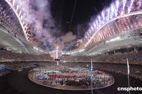 可容納七萬二千名觀眾的雅典奧林匹克體育場座無虛席,主題為“浪漫愛琴!钡拈_幕慶典獨(dú)具匠心,使現(xiàn)場氣氛達(dá)到了高潮。伴隨著悠揚(yáng)的音樂和震天的鼓聲,一道彗星狀火焰從天而降,在“愛琴海”中點(diǎn)燃了奧運(yùn)五環(huán)標(biāo)志。一個(gè)名叫帕薩斯的男孩乘一條白色小船緩緩駛?cè)搿昂!敝校种袚]舞一面希臘國旗。國際奧委會(huì)主席羅格、雅典奧組委主席安吉洛普洛斯和希臘總統(tǒng)斯特凡諾普洛斯三人一起迎接他的到來。此時(shí)體育場大屏幕打出了本屆奧運(yùn)會(huì)會(huì)徽——象征和平與自由的橄欖枝。