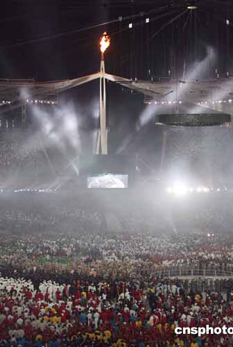 首次實(shí)現(xiàn)了真正意義上的全球傳遞的奧運(yùn)圣火被傳遞到最后一名火炬手——希臘帆船世界冠軍科納馬納斯基手中,他用手中的小火炬點(diǎn)燃了紡錘形的主火炬,火炬臺(tái)慢慢回立至高空,奧運(yùn)圣火在奧林匹克發(fā)源地熊熊燃起,光耀全球。