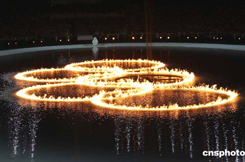 當(dāng)?shù)貢r(shí)間八月十三日晚,第二十八屆奧運(yùn)會(huì)在希臘雅典開幕。圖為開幕式上奧運(yùn)五環(huán)標(biāo)志從“愛琴!敝猩。中新社記者:毛建軍