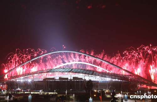 當(dāng)?shù)貢r間8月13日晚,雅典奧運(yùn)會盛大的開幕式在主體育場舉行,五顏六色的焰火映紅雅典夜空。中新社記者:任晨鳴