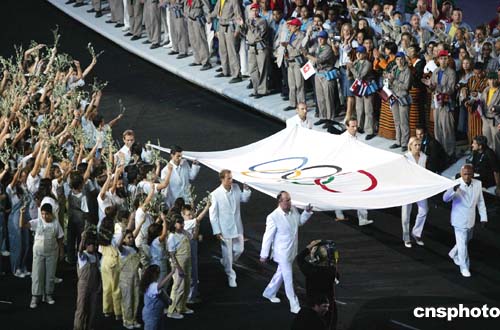 當(dāng)?shù)貢r(shí)間八月十三日晚,第二十八屆奧運(yùn)會(huì)在希臘雅典開(kāi)幕,奧運(yùn)五環(huán)旗進(jìn)入開(kāi)幕式會(huì)場(chǎng)。中新社記者:毛建軍