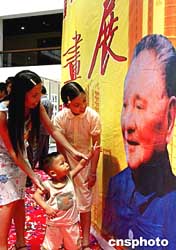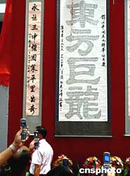 著名書(shū)畫(huà)家朱繼峰創(chuàng)作的巨法書(shū)法作品《東方巨龍》,八月十四日在深圳舉辦的紀(jì)念鄧小平誕辰一百周年書(shū)畫(huà)展上出展,這幅用九百九十九個(gè)“壽”字組成的作品,一九九四年被鄧小平家人收藏。中新社記者:宋吉河