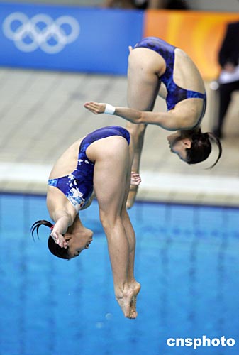當(dāng)?shù)貢r間八月十四日晚,郭晶晶與吳敏霞在雅典奧運跳水館獲得第二十八屆奧運會女子三米板雙人金牌。中新社記者:毛建軍