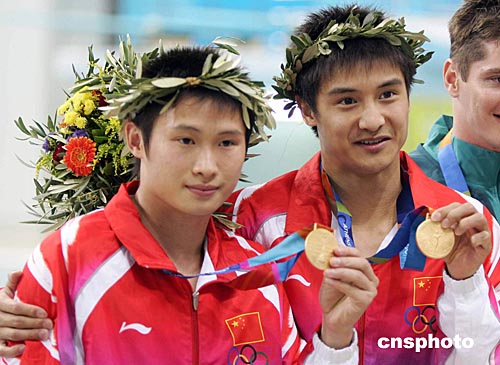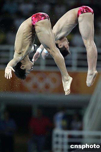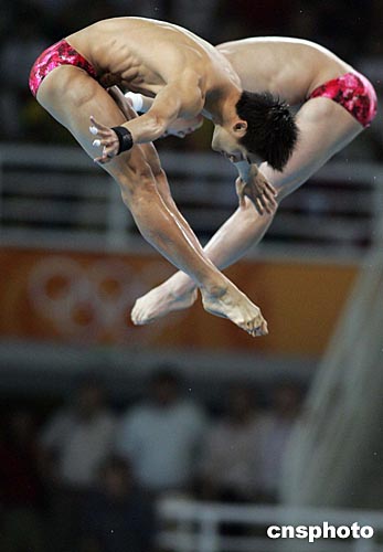 當(dāng)?shù)貢r(shí)間八月十四日晚,中國(guó)跳水隊(duì)田亮、楊景輝在雅典奧運(yùn)跳水館獲得男子雙人十米跳臺(tái)金牌。中新社記者:毛建軍