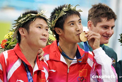 當(dāng)?shù)貢r(shí)間八月十四日晚,中國跳水隊(duì)田亮、楊景輝在雅典奧運(yùn)跳水館獲得男子雙人十米跳臺金牌。中新社記者:毛建軍