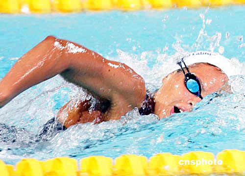 當?shù)貢r間八月十五日晚,在雅典舉行的第二十八屆奧運會游泳比賽中,法國選手MANAUDOU LAURE以四分零五秒三四的成績獲得女子四百米自由泳金牌。中新社記者:毛建軍