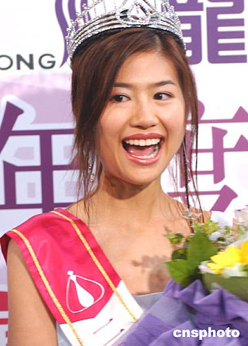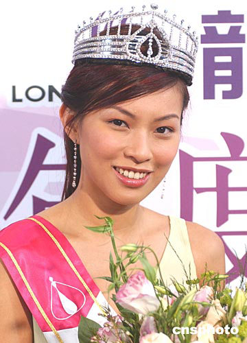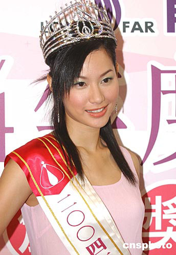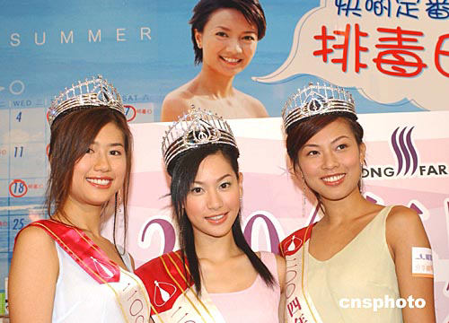 2004年度香港小姐冠軍徐子珊﹑亞軍朱慧敏﹑季軍符思思16日在會展中心出席香港龍發(fā)制藥集團頒獎儀式。中新社記者:趙振清