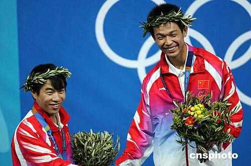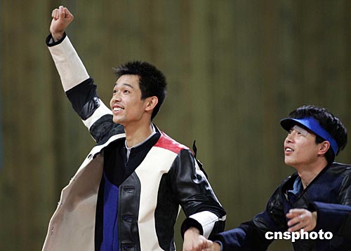 當(dāng)?shù)貢r(shí)間八月十六日,中國選手朱啟南(左)與李杰在雅典奧運(yùn)男子十米氣步槍射擊比賽中分獲金、銀牌。朱啟南并以七百零二環(huán)的成績打破世界紀(jì)錄。中新社記者:毛建軍