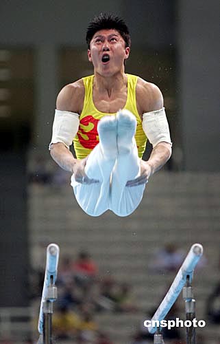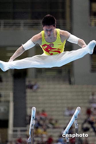 李小鵬在雙杠比賽中表現(xiàn)出色,顯示出個人實力。