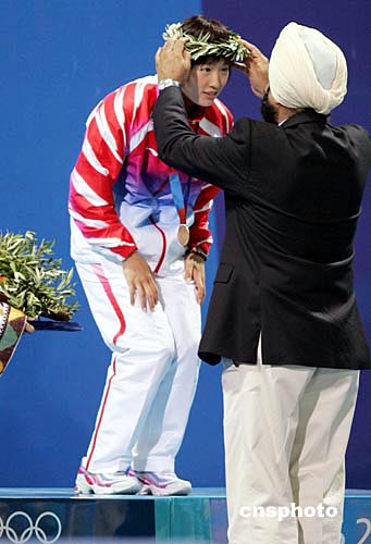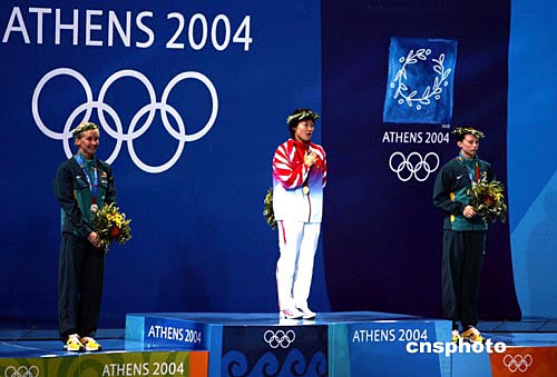 參加雅典奧運(yùn)會(huì)游泳比賽的中國(guó)選手極少擁有問鼎獎(jiǎng)牌實(shí)力者,羅雪娟在當(dāng)?shù)貢r(shí)間八月十六日晚奇跡般奪得女子一百米蛙泳金牌。這是她登上領(lǐng)獎(jiǎng)臺(tái)最高層,頭戴橄欖桂冠,面對(duì)冉冉升起的中國(guó)國(guó)旗激動(dòng)得和唱著國(guó)歌。中新社記者:任晨鳴