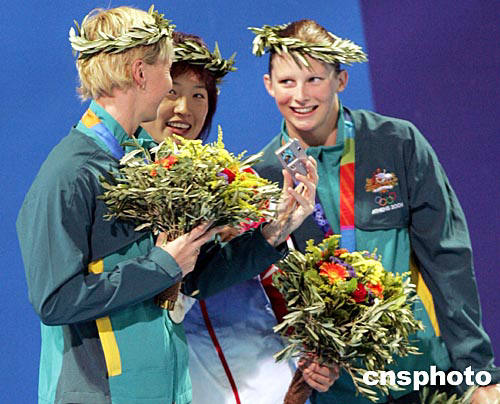 中國選手羅雪娟,雅典當(dāng)?shù)貢r間八月十六日晚奇跡般奪得第二十八屆奧運會女子一百米蛙泳金牌。這是她在冠軍領(lǐng)獎臺上,頭戴橄欖桂冠,接受獲得第二、第三名的澳大利亞選手祝賀。中新社記者:任晨鳴