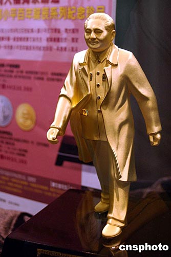 為紀(jì)念鄧小平一百周年誕辰,香港周大福金店向市面推出“鄧小平百年誕辰系列紀(jì)念珍品”,純金塑像及紀(jì)念金銀幣引人注目。作者:洪少葵