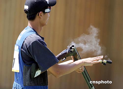 當(dāng)?shù)貢r(shí)間八月十七日,中國(guó)選手王正在雅典奧運(yùn)男子雙向飛碟射擊比賽中獲得銅牌。中新社記者:毛建軍