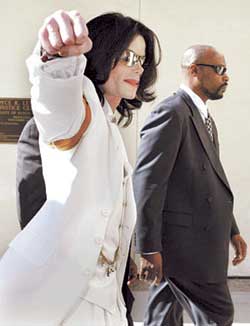 杰克遜這次身著的三件套裝全部為白色,另外他還戴了一個金色的袖標(biāo)以及腳蹬一雙亮閃閃的白色靴子。他乘坐一輛金色的加長房車抵達(dá)法庭門口,下車時受到了100多個大聲尖叫的歌迷的歡迎。