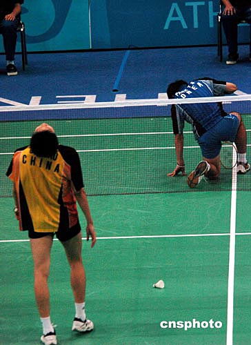 中國羽球選手鮑春來與韓國樸泰相在激烈對抗后均認為自己失手而雙雙長嘆。后裁判認定該球韓國選手勝。最終結(jié)果是鮑春來被淘汰。作者:陳佳