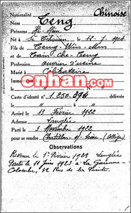 卡片的主要內(nèi)容為———國(guó)籍:中國(guó);姓名:鄧希賢;出生:四川,1904年7月12日(中國(guó)農(nóng)歷———編者注);父親:鄧文明;職業(yè):工廠工人;婚姻狀況:未婚;身份卡號(hào)碼:1·250·349;到達(dá)日期:1922年2月13日;居住地點(diǎn):leangle;離開時(shí)間:1922年11月3日;目的地:賽納-夏狄戎中學(xué);備注:1923年2月1日重返leangle;1923年6月11日離去,前往拉加雷納-科隆市的德拉普安特街39號(hào)。