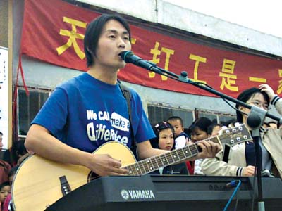 “打工青年藝術(shù)團(tuán)”成立于2002年5月1日,初始團(tuán)員10人,都是來自各行各業(yè)的打工青年,他們利用業(yè)余時(shí)間到工地、工廠和小區(qū)給打工者們演出,兩年來共演出了100多場(chǎng),累計(jì)觀眾達(dá)到了20000多人次,在北京打工者中間受到熱烈的歡迎,很多人直接從觀眾加入到了演員隊(duì)伍。隨著影響的擴(kuò)大,他們還成立了“農(nóng)友之家”社會(huì)公共服務(wù)機(jī)構(gòu),為打工者提供法律咨詢、文化教育、權(quán)益維護(hù)、大眾電腦教室、社區(qū)互助圖書館等多方面的幫助。
