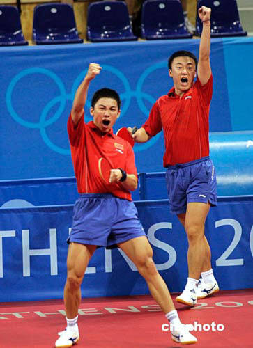 雅典時間八月十八日上午,中國乒乓球男雙搭檔馬琳、陳杞以中4:2戰(zhàn)勝荷蘭選手凱恩、赫斯特爾,晉級奧運男雙8強。中新社記者:張煒