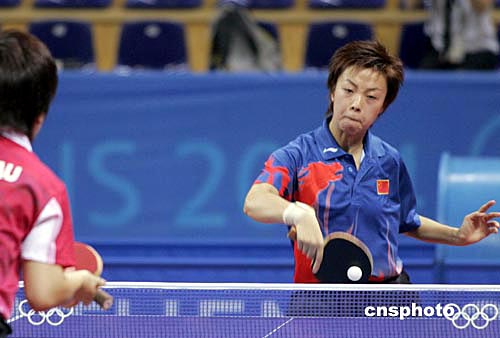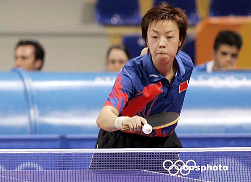 在雅典時(shí)間18日晚進(jìn)行的奧運(yùn)乒乓女單比賽中,中國選手張怡寧以四比一戰(zhàn)勝中國香港選手柳絮飛,晉級八強(qiáng)。中新社記者:張煒