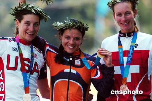 當(dāng)?shù)貢r(shí)間8月18日,荷蘭選手Zijlaard-van-Moorsel喜摘女子自行車(chē)24公里賽桂冠。圖為她和亞軍美國(guó)選手Deidre Demet-Barry及銅牌得主Karin Thuerig一起登上領(lǐng)獎(jiǎng)臺(tái)。