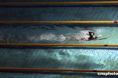 圖為一名參加奧運(yùn)比賽的游泳運(yùn)動(dòng)員在晚上獨(dú)自練習(xí)的場景。