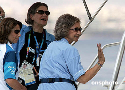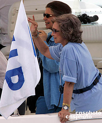 在當(dāng)?shù)貢r間8月17日舉行的女子470級的帆船帆板比賽中,西班牙皇后索菲婭親臨現(xiàn)場,為運(yùn)動員打氣。