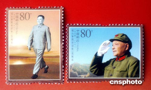 為紀(jì)念鄧小平誕辰100周年,中國國家郵政局將于2004年8月22日發(fā)行《鄧小平同志誕生一百周年》紀(jì)念郵票1套2枚,小型張1枚。兩枚郵票的名稱分別為:中共中央總書記(左)、中共中央軍委主席(右),面值均為人民幣80分。小型張圖案名稱為:改革開放和現(xiàn)代化建設(shè)總設(shè)計師,面值人民幣6元。中新社記者:鄒憲