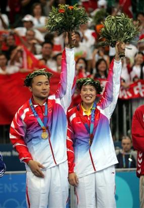 中新社雅典八月十九日電 中國雅典奧運羽毛球隊今天一掃前兩日男單、男雙盡墨的陰霾。繼張寧摘取女單桂冠后,悉尼奧運冠軍張軍/高崚又衛(wèi)冕成功。在剛剛結束的混雙決賽中他們以二比一的總比分戰(zhàn)勝了來自英國的羅伯遜/埃姆,三局比分分別為十五比一、十二比十五和十五比十二。