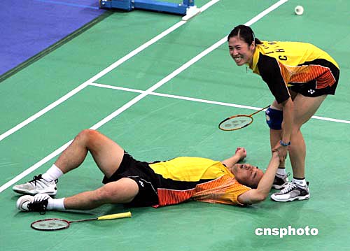 決勝局,張軍/高崚在開局連取三分后十多分鐘內(nèi)一直在看著對手不停地得分,急性子的張軍進攻不力,而且連續(xù)出現(xiàn)失誤。好在英國球員在十一比八領先時心理上也出現(xiàn)變化,失誤增多,中國球員乘機反撲,連奪六分拿到了冠軍點,并以十五比十二取得了最后的勝利。