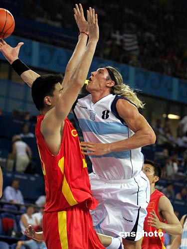 第二節(jié)開始,在阿根廷隊的全場緊逼戰(zhàn)術(shù)下,中國隊將第一節(jié)失誤的頻率進一步加快,成全阿根廷隊打出了十七比二的高潮。至上半場結(jié)束,中國隊以二十一比四十一落后二十分。姚明僅僅得三分,五個籃板。