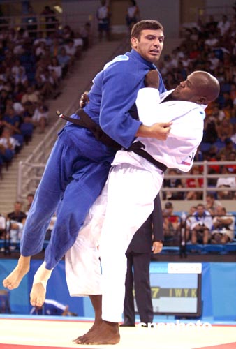 當?shù)貢r間8月19日,希臘選手Vasileios與古巴選手Oreidis在男子100公斤級柔道賽場上一爭高下。