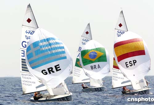 圖為8月19日奧運會女子帆船比賽希臘隊勇奪冠軍的情景。