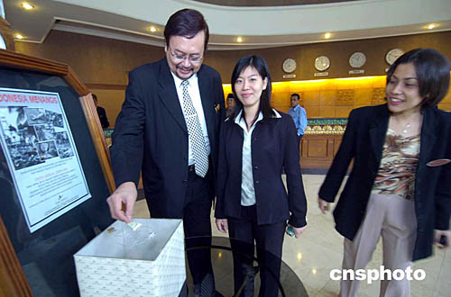 1月6日,印度尼西亞棉蘭市安卡莎酒店的總經(jīng)理及管理高層人員在酒店大堂設(shè)置的籌款箱捐款,安卡莎酒店在印度尼西亞班達(dá)亞齊遭受海嘯災(zāi)難后隨即展開籌款并將近10萬港幣善款送往災(zāi)區(qū)。作者:洪少葵