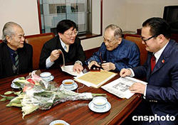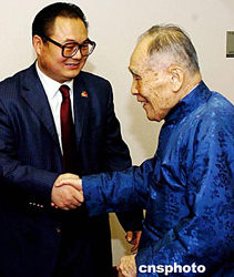 大會主席周茳釤鈞(右)、副主席王錦彪(左),看望香港南洋商業(yè)銀行名譽(yù)董事長莊世平先生,并征求莊老對大會的建議。