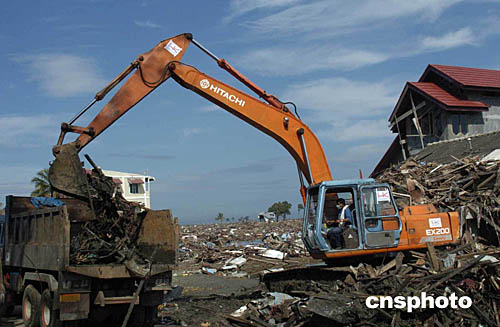中新社報(bào)道組昨日在班達(dá)亞齊市內(nèi)看到,清理廢墟工作較記者前日抵達(dá)時(shí)明顯加快。上百臺(tái)挖泥機(jī)、推土機(jī)、載泥車等重型機(jī)械及眾多救援人員早上即開始工作。他們用挖泥機(jī)、推土機(jī)等將大型廢墟掘開、鏟起,裝上載泥車駛出市區(qū),集中到專門辟出的區(qū)域暫時(shí)堆放。如在清理過程中發(fā)現(xiàn)新的遇難者遺體,救援和醫(yī)療人員會(huì)將遺體包裹好,再由專門車輛運(yùn)至指定區(qū)域埋葬。