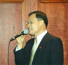 晚宴的主角、新到任的副總領(lǐng)事曠偉霖隨后來(lái)到臺(tái)前,向主辦宴會(huì)的僑團(tuán)表示感謝。他表示,在他到任剛剛四十幾個(gè)小時(shí)就收到了宴請(qǐng)的通知,令他十分感動(dòng),僑胞的熱情令他感受到很大的鼓勵(lì)和支持。