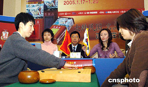 一月二十日,中國(guó)隊(duì)主將芮乃偉九段(圖左)執(zhí)黑中盤(pán)擊敗韓國(guó)隊(duì)主將樸志恩五段,使得中國(guó)隊(duì)獲得第三屆正官莊杯三國(guó)女子圍棋擂臺(tái)賽冠軍,這也是中國(guó)隊(duì)獲得的首個(gè)女子團(tuán)體賽冠軍。作者:湯彥俊