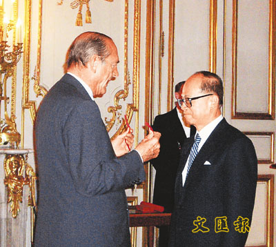 中新網(wǎng)1月25日電 據(jù)香港文匯報報道,法國政府早前向香港富商、長和系主席李嘉誠頒授榮譽軍團司令勛章(Commandeur de la Legion d,honneur)。授勛儀式在上周四晚在巴黎總統(tǒng)府愛麗舍宮舉行,由法國總統(tǒng)希拉克親自主持。