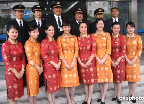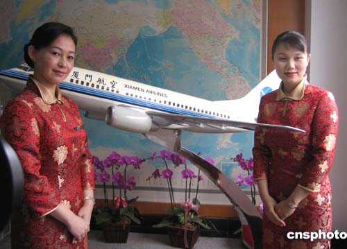 廈航臺(tái)商春節(jié)包機(jī)上的空姐,大都來自廈門等閩南地區(qū),將身著改良的唐裝提供閩南話服務(wù)。圖為一月二十七日包機(jī)空姐身著新裝亮相。楊伏山 攝