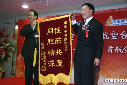 國(guó)航董事長(zhǎng)李家祥(右)向臺(tái)灣華航董事長(zhǎng)江耀宗贈(zèng)送禮品。作者:邢利宇