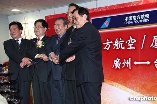 圖中從左到右為廈門航空公司總經(jīng)理吳榮南、南方航空公司總經(jīng)理司獻(xiàn)民、臺(tái)北交通局局長(zhǎng)張國(guó)政、臺(tái)灣華航董事長(zhǎng)江耀宗、臺(tái)灣復(fù)興航空公司董事長(zhǎng)范志強(qiáng)。作者:邢利宇